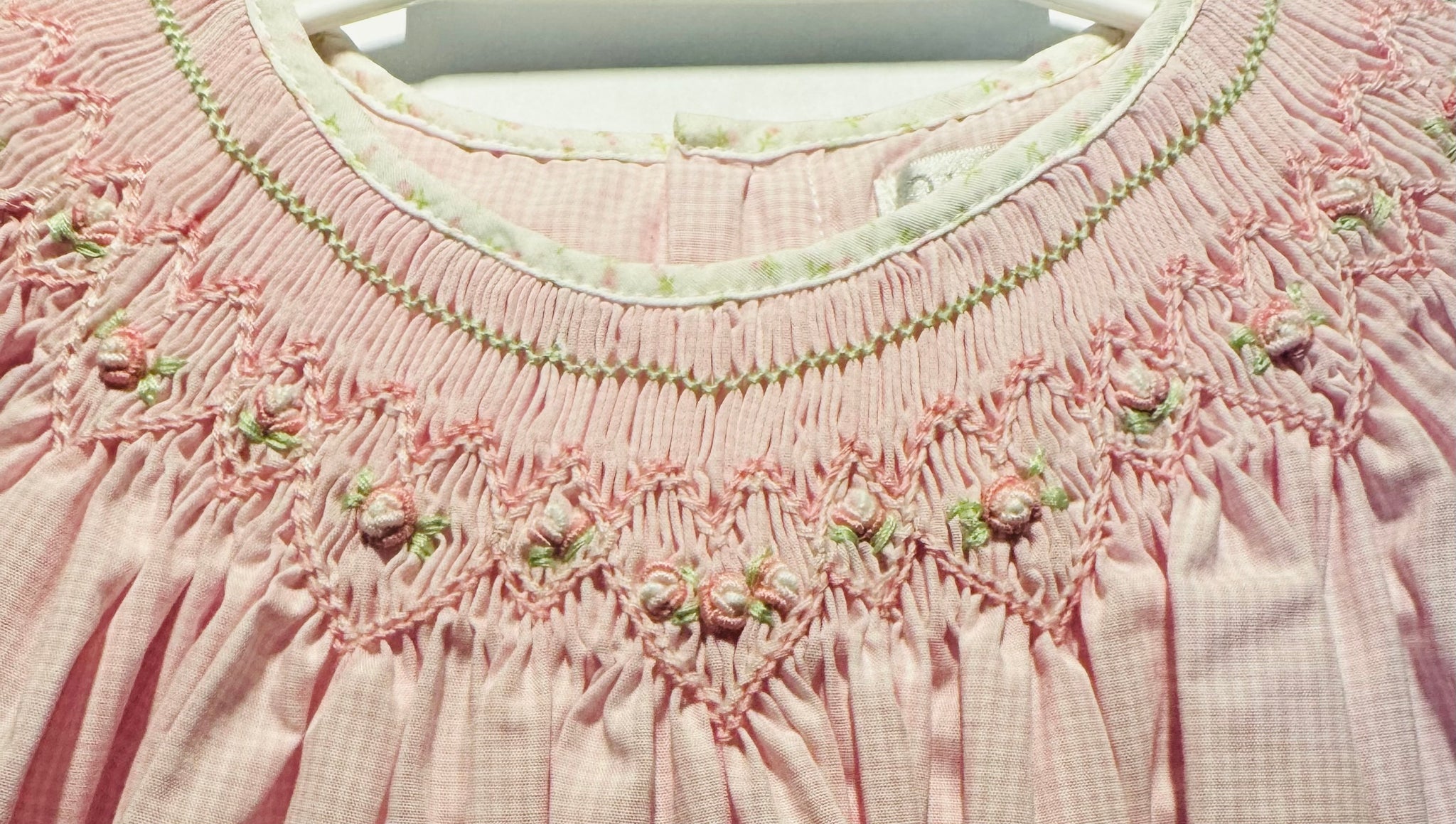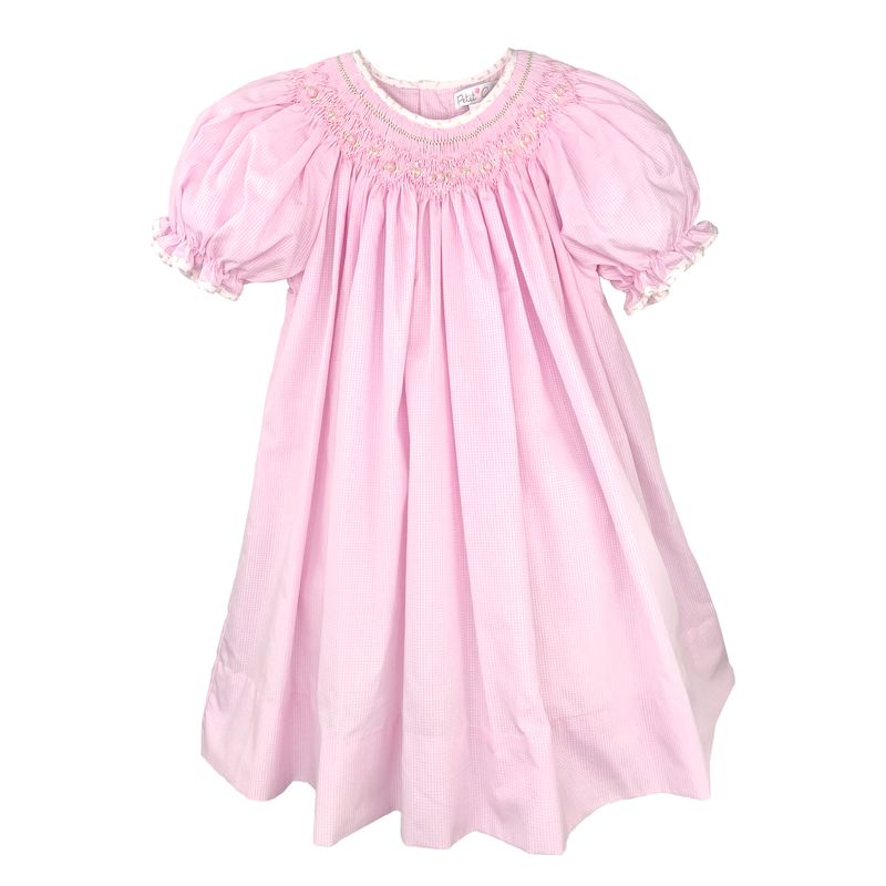 This charming pink check dress features delicate smocking with pink and green embroidery and tiny pink flowers. Soft floral trim adorns the neckline and sleeves for an extra-sweet touch. Functional back buttons make dressing easy. Crafted from a comfortable cotton-poly blend, it's perfect for special occasions or everyday wear. A timeless piece that captures classic children's style.