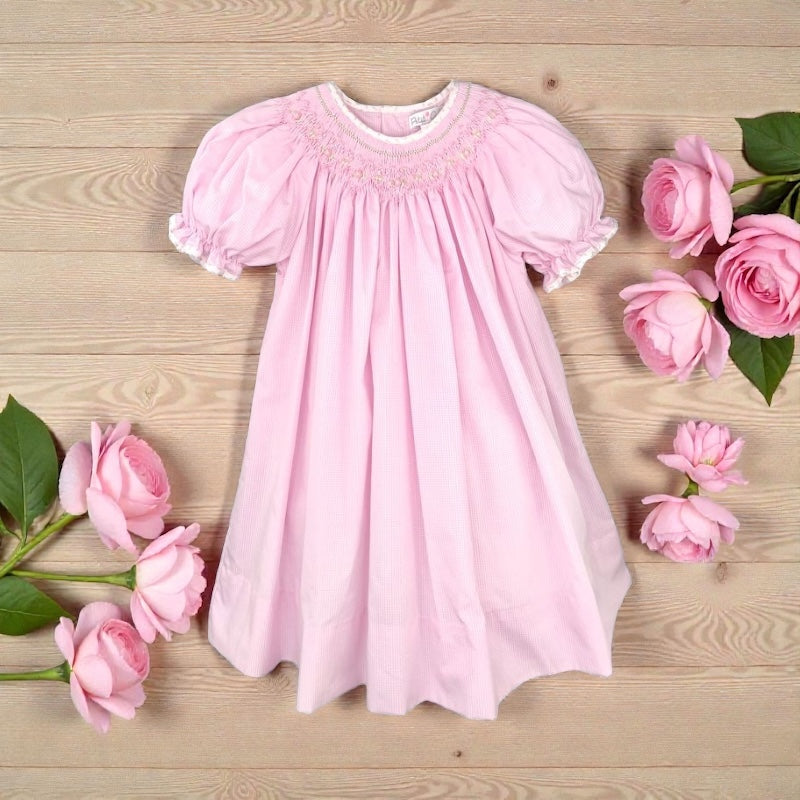 Pink Check Floral Trimmed Bishop Smocked Dress | 2T 3T 4T